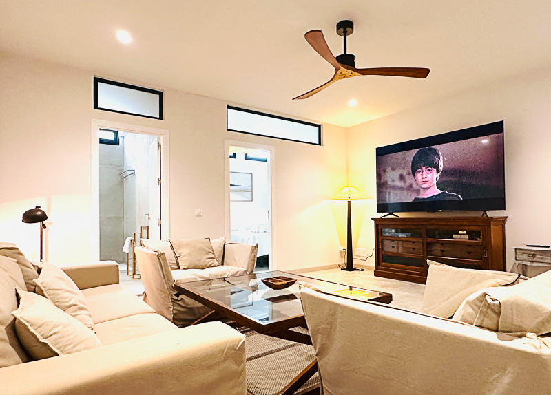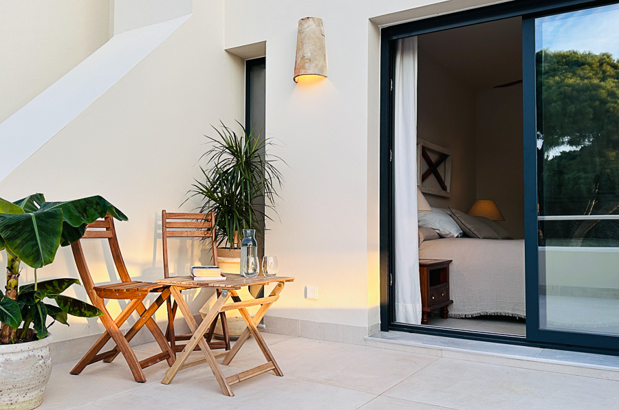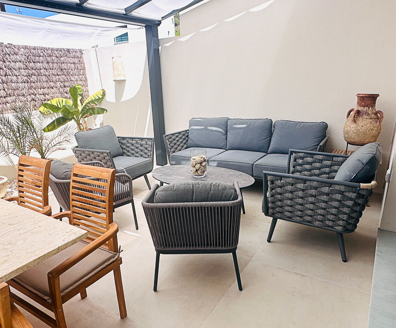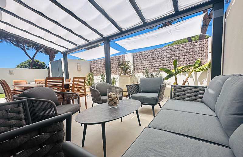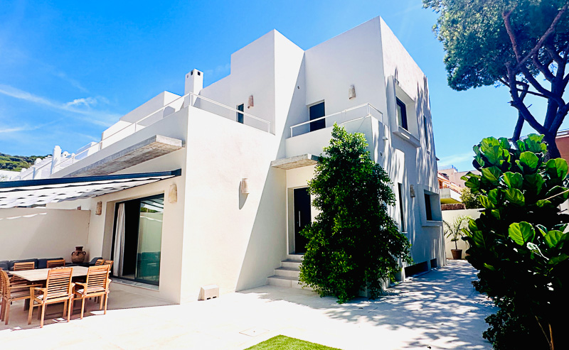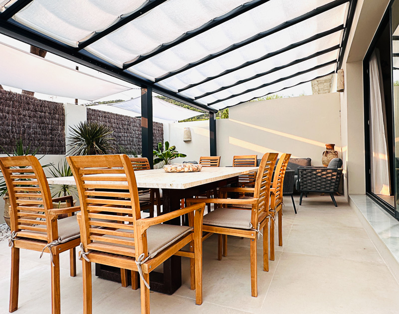 Sus exteriores y jardines están diseñados para la vida al aire libre en cualquier época del año: una gran mesa de comedor en mármol travertino junta a la amplia zona de estar bajo el gran porche acristalado de la fachada principal, zona de césped para relajarse, zona de cocina exterior, y una maravillosa ducha a cielo abierto con agua caliente, completan la experiencia.