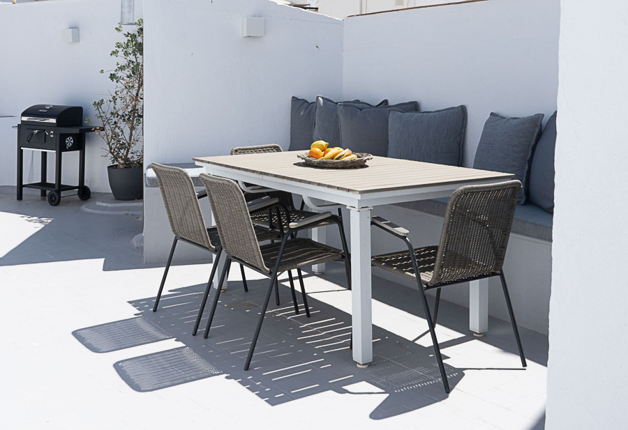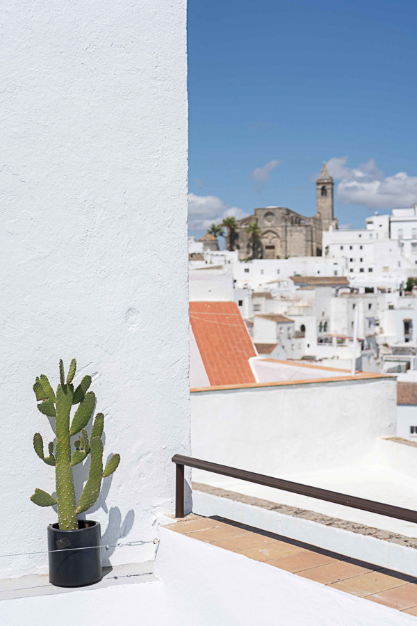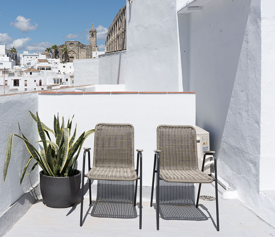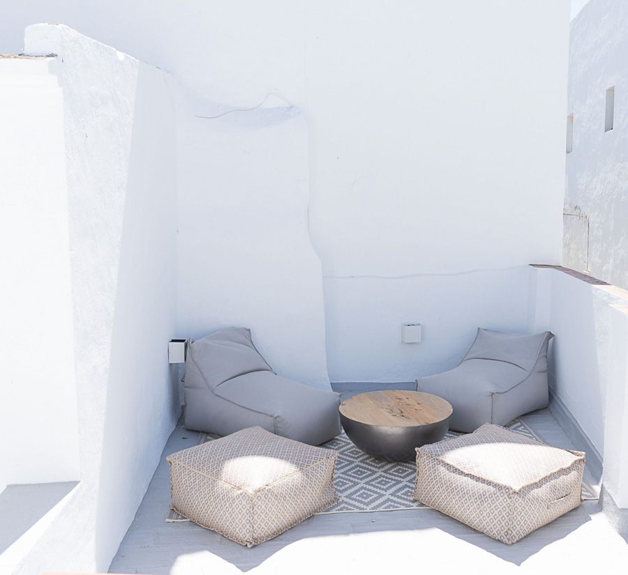 Desde la suite principal, una escalera conduce a la azotea, un espacio pensado para disfrutar del aire libre y las vistas. La terraza cuenta con comedor exterior, cocina de verano equipada (máquina de hielo, nevera para bebidas, lavavajillas y cristalería), zona de lavadero con WC, lavadora y secadora, y barbacoa de carbón. Un rincón chill-out de inspiración marroquí invita a relajarse con vistas a la iglesia, el castillo y las murallas. Orientada al sureste, la terraza disfruta de luz durante gran parte del día y se convierte en el lugar perfecto para cerrar la jornada tras un día de playa en la Costa de la Luz.