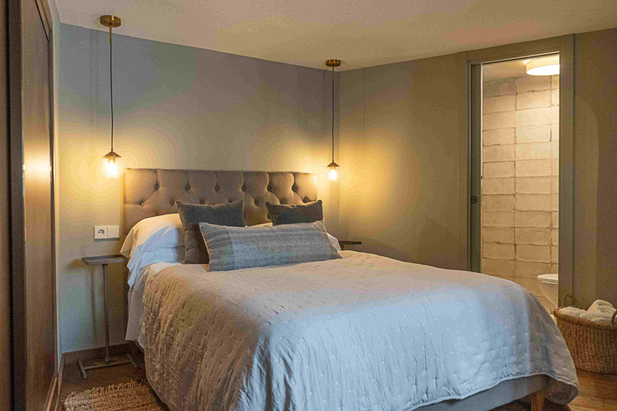 El segundo dormitorio doble (cama de 150 cm), situado en la planta baja, cuenta con acceso tanto desde el interior como desde una entrada independiente en la calle. Decorado en tonos neutros, ofrece un ambiente tranquilo y dispone de lavabo separado y baño privado, lo que lo convierte en una opción ideal para dos parejas o una familia con niños mayores.