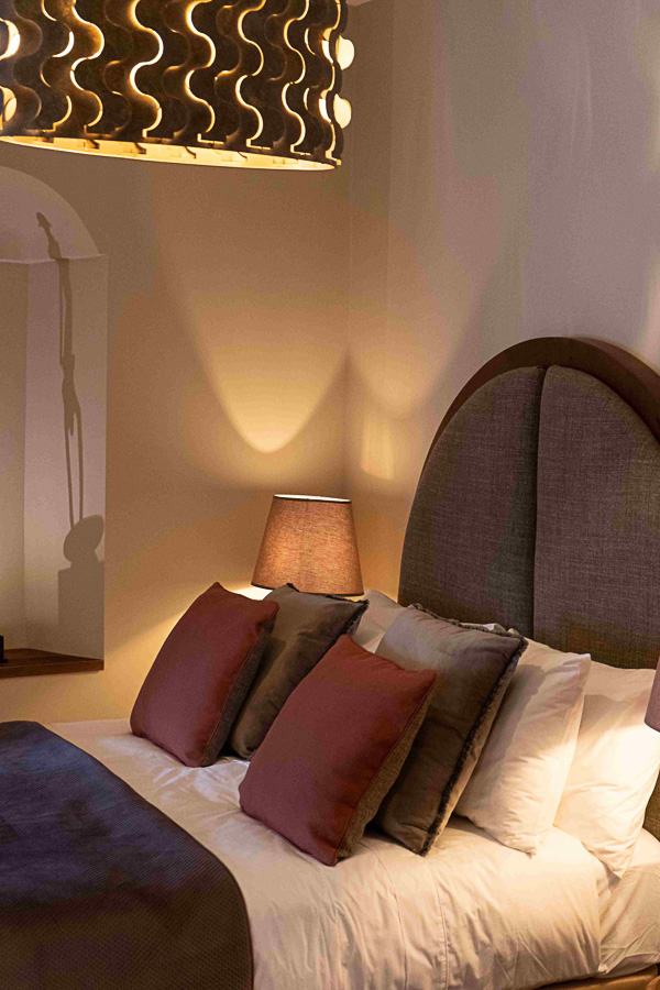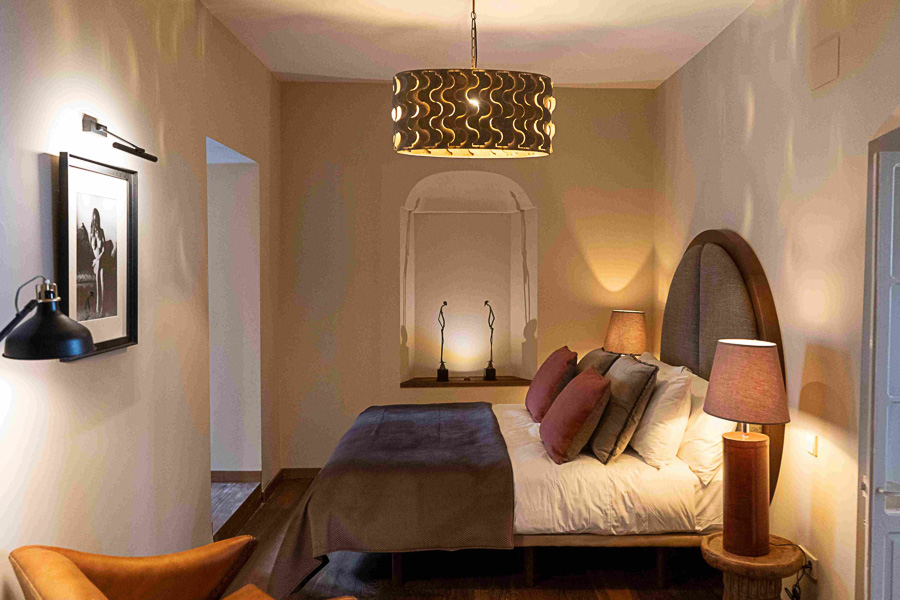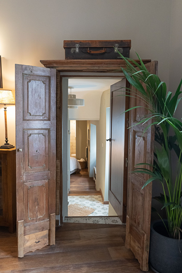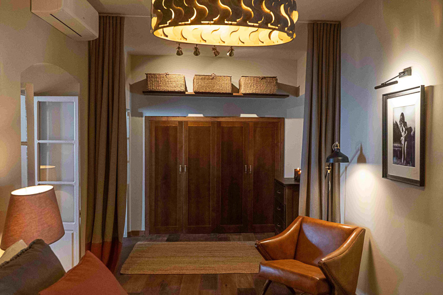 El dormitorio principal, con cama de 180 cm, combina un cabecero elaborado a mano con un sillón de cuero, creando un ambiente sereno y cuidado. Unas cortinas drapeadas separan el vestidor, equipado con armarios a medida. El baño en suite es amplio y luminoso, con ducha de 1,7 m, doble lavabo, tocador y WC independiente.