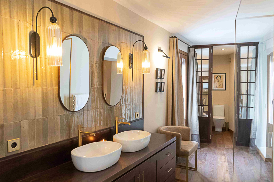 Los baños de la casa destacan por sus azulejos italianos y grifería de bronce, mientras que la luz natural se multiplica gracias a los ventanales y un gran espejo de suelo a techo.