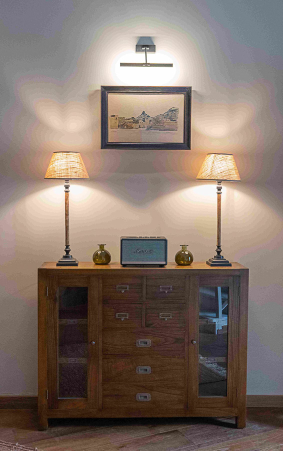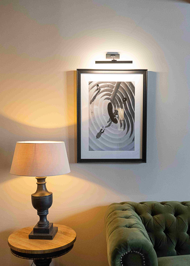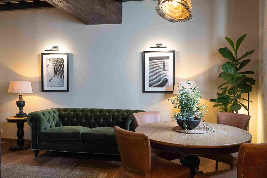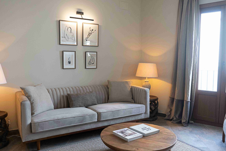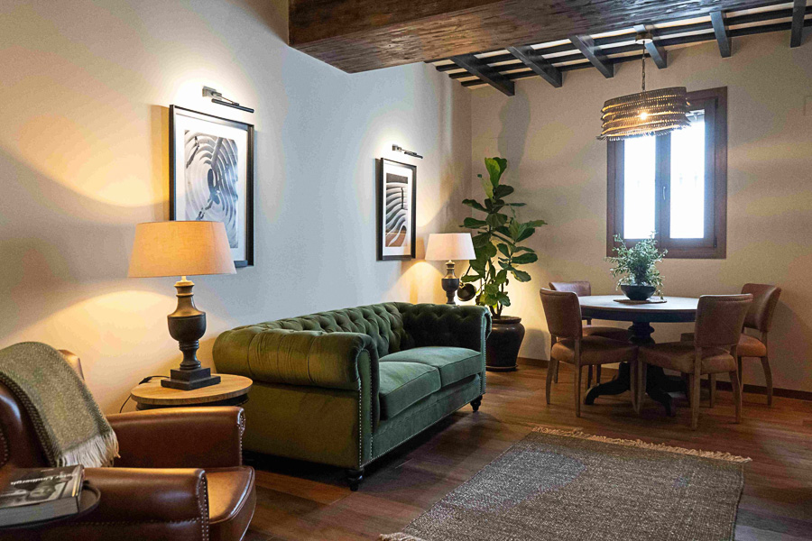 El espacio se viste con elementos únicos: sofás Chesterfield, una iluminación ambiental sutil, obras de arte originales de Cádiz y Marruecos y láminas enmarcadas que aportan personalidad y coherencia al conjunto. El resultado es una casa confortable con un diseño cuidado.