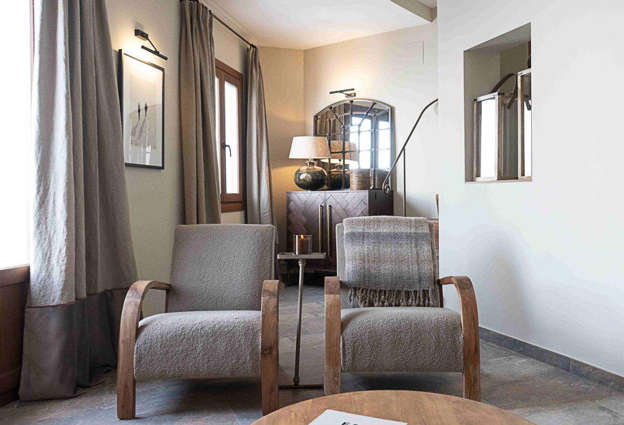 Una elegante escalera de mármol conduce a la primera planta, donde se abre una segunda sala de estar con suelo de piedra italiana, sofá de inspiración Art Decó y dos sillones de nogal y bouclé. Las cortinas de lino francés visten las ventanas con vistas a la calle, mientras que un mueble bar y un espejo completan el espacio con un toque sofisticado.