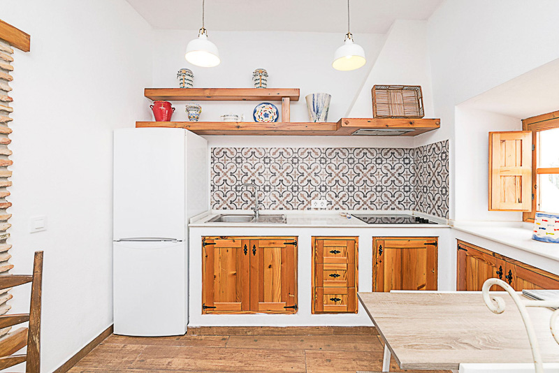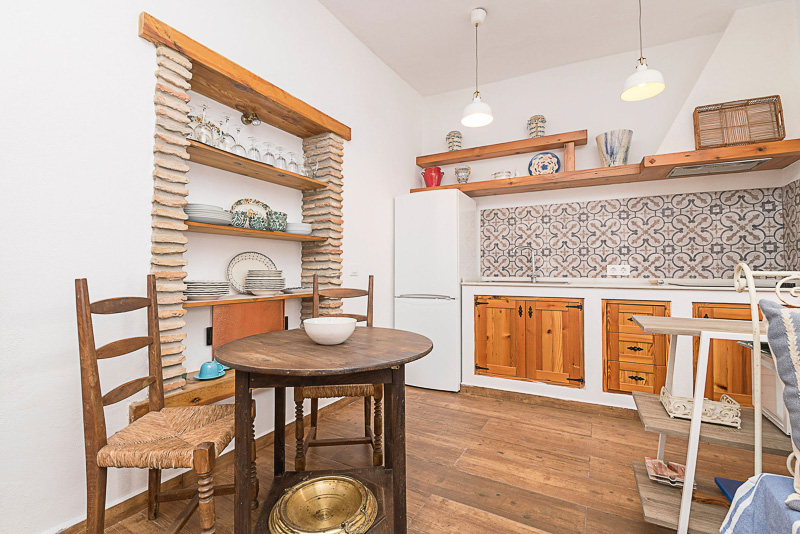 En la planta baja se accede directamente a la zona de estar, donde se integra una pequeña cocina, una mesa para desayunos y un aseo. Desde este mismo espacio, una segunda puerta conduce a un pequeño patio interior donde se encuentra la lavadora.