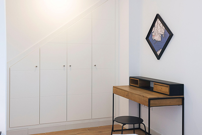 En la planta inferior se sitúa la zona de descanso, compuesta por dos dormitorios: el principal, con cama de 180 cm, armario y escritorio, y un segundo con dos camas individuales. En este nivel también se encuentra un baño completo con ducha.